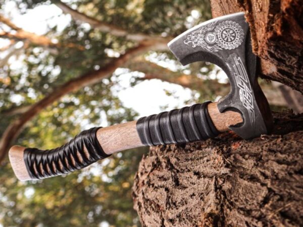 The handle of this axe is crafted from premium rosewood, renowned for its strength, resilience, and striking appearance. The rich, dark hues of the rosewood not only provide durability but also ensure a smooth, comfortable grip. The handle is further enhanced with intricate hand engravings, showcasing beautiful Viking designs that add a personal and artistic touch to this powerful tool.