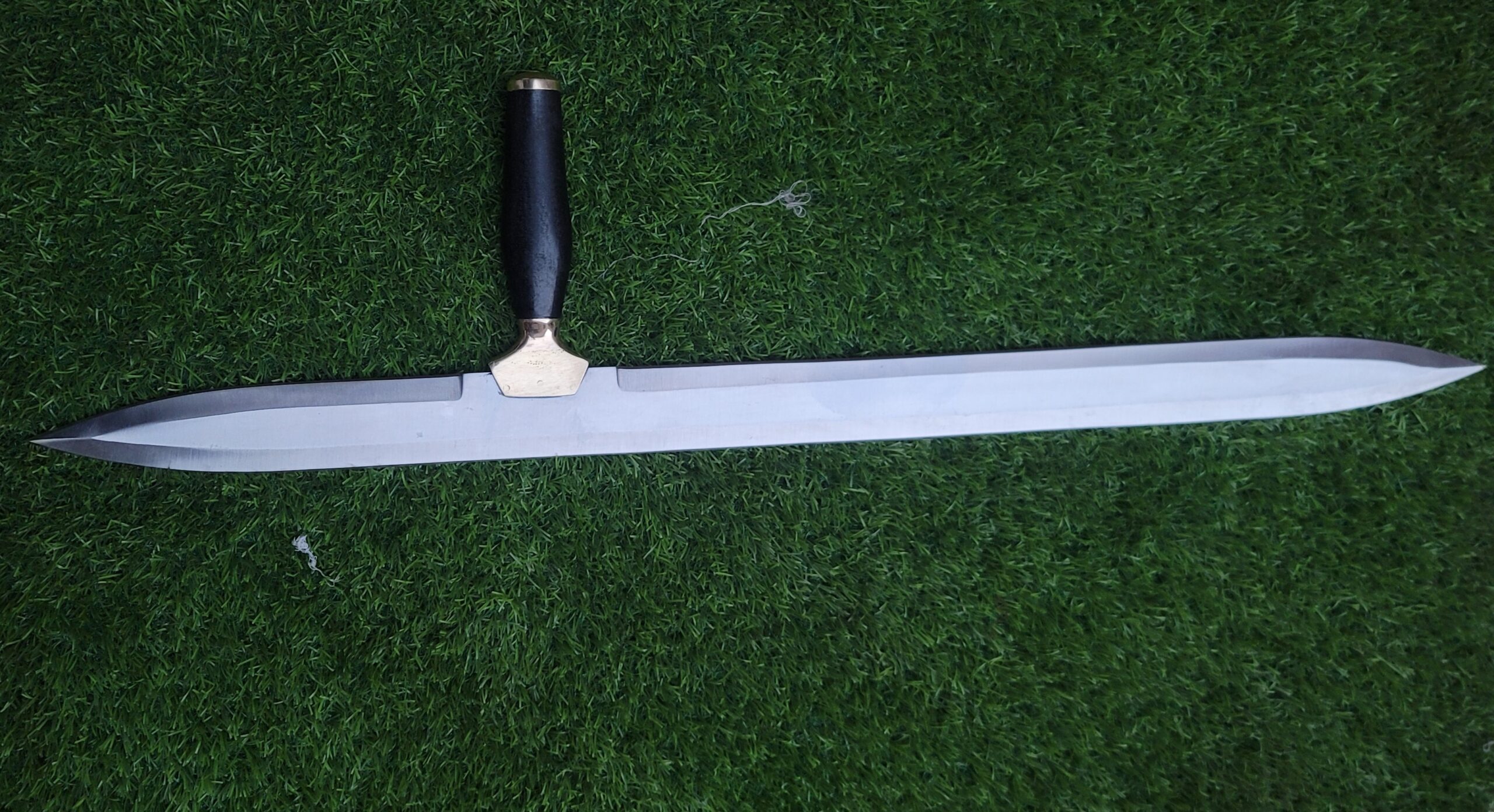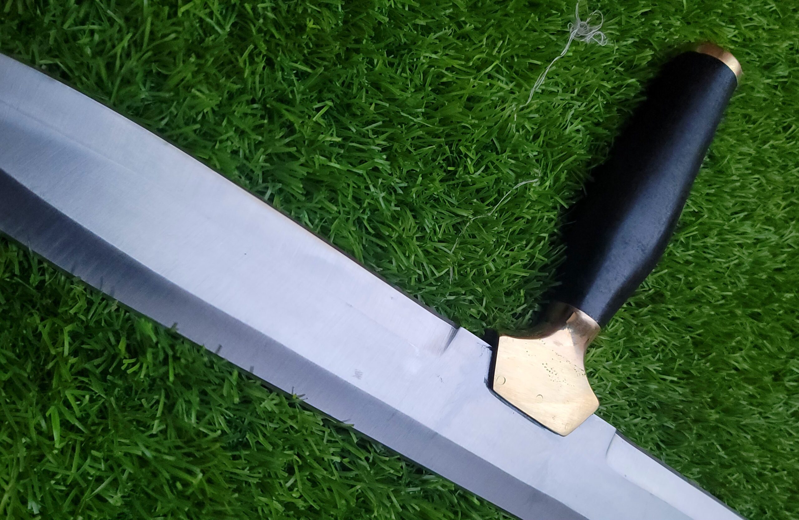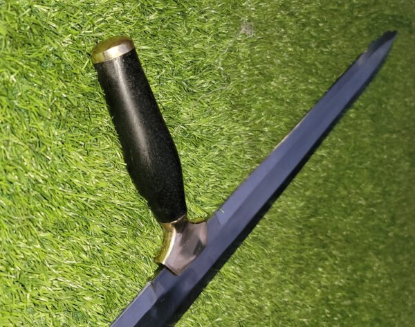 The handle of the sword is made from black micarta, a high-performance material known for its exceptional durability and resistance to wear. Its textured surface provides a secure, comfortable grip, ensuring the sword is easy to control. The brass guard adds an elegant touch while also offering protection from the blade.